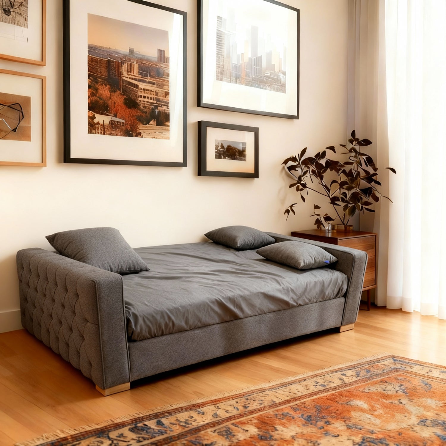 تتميز الكنبة بثلاث وضعيات مختلفة: الجلوس، الاسترخاء، والنوم، مما يجعلها مثالية للاستخدام اليومي أو استقبال الضيوف. تأتي بتصميم عملي مع شرائح خشبية داعمة وإسفنج عالي الكثافة يمنحك تجربة جلوس ونوم مريحة.