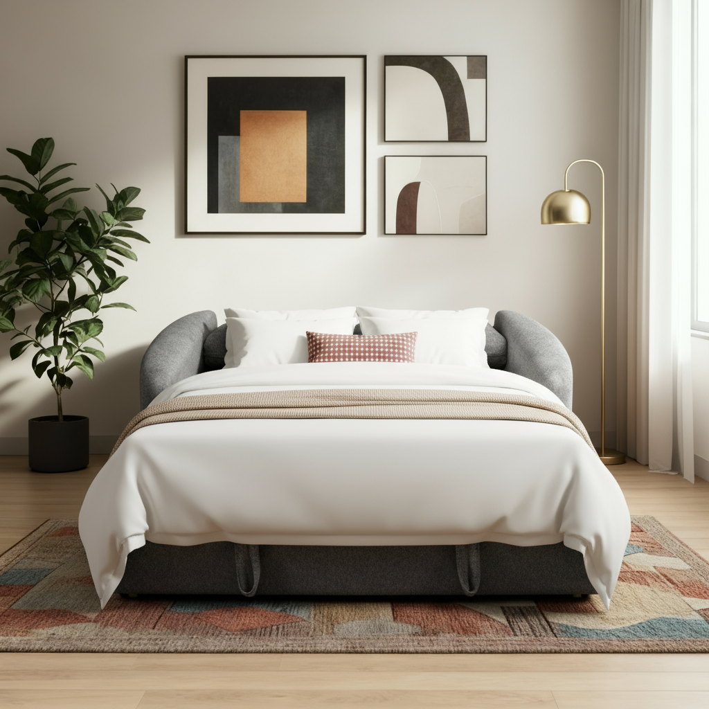 كنبه سرير الخيار الأمثل للمساحات الصغيرة أو الغرف التي تُستخدم لعدة أغراض وتتميز بتصميم عصري ومظهر أنيق.تأتي هذه الكنبة المميزة بمقعدين مريحين ووسائد خلفية فاخرة، بالإضافة إلى أذرع كبيرة توفر دعمًا إضافيًا وراحة قصوى. وإذا كنت بحاجة إلى مساحة إضافية للنوم، فلا داعي للقلق! يمكنك بسهولة سحب الإطار السفلي وتحويلها إلى سرير مريح يتسع لشخصين خلال ثوانٍ معدودة.