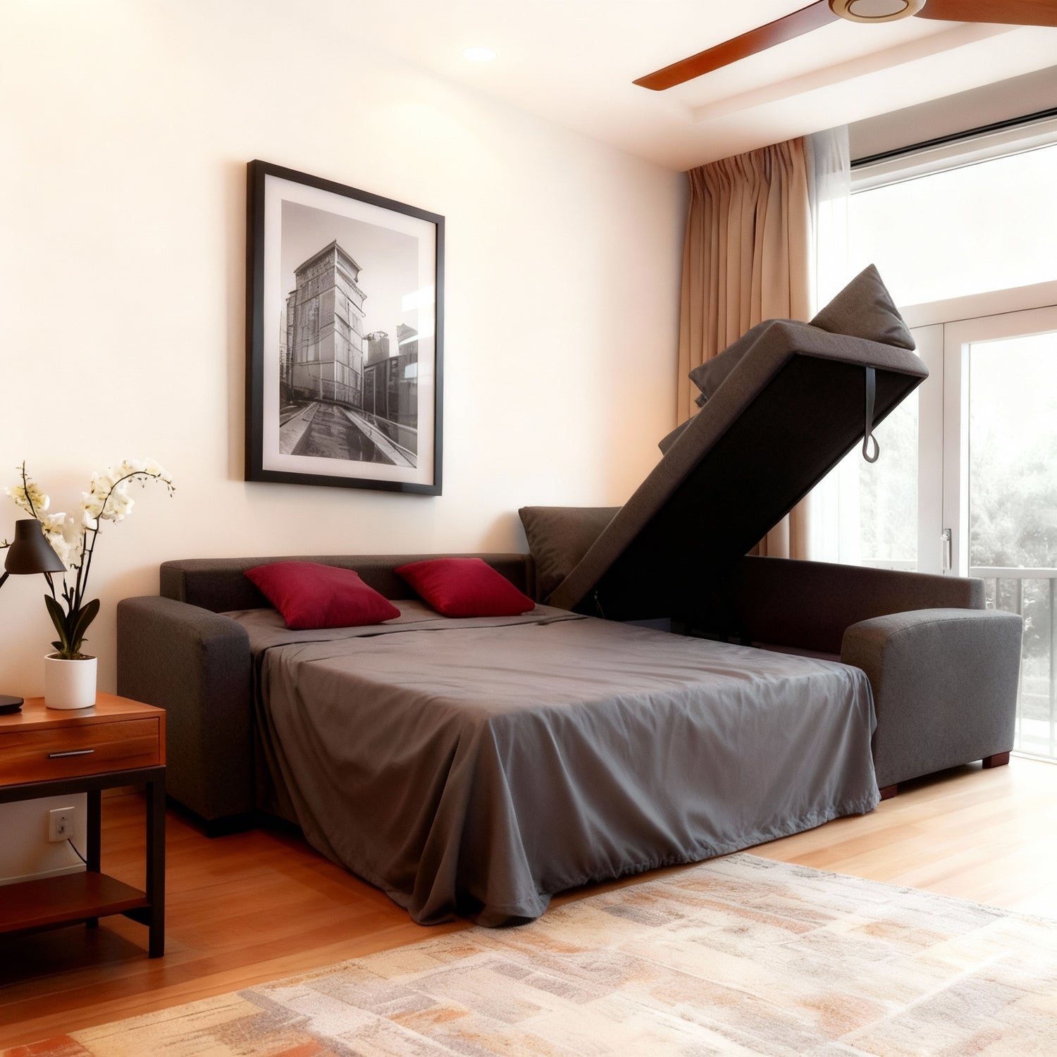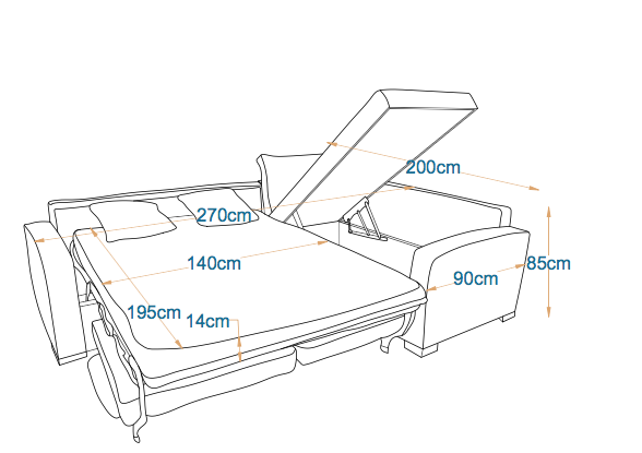 حوّل مساحة معيشتك الي غرفة نوم واسعة ومريحة، تجمع بين الراحة والرقي مع مرتبة إرتفاع 14 سم قابلة للطي بعرض140 سم، ومزيج متطور من الراحة والعملية والتصميم العصري. تتميز هذه الركنه بآليات Sedac -Meral المتطورة، ويوفر مساحة تخزين واسعة ومتانة وأناقة لا مثيل لها.