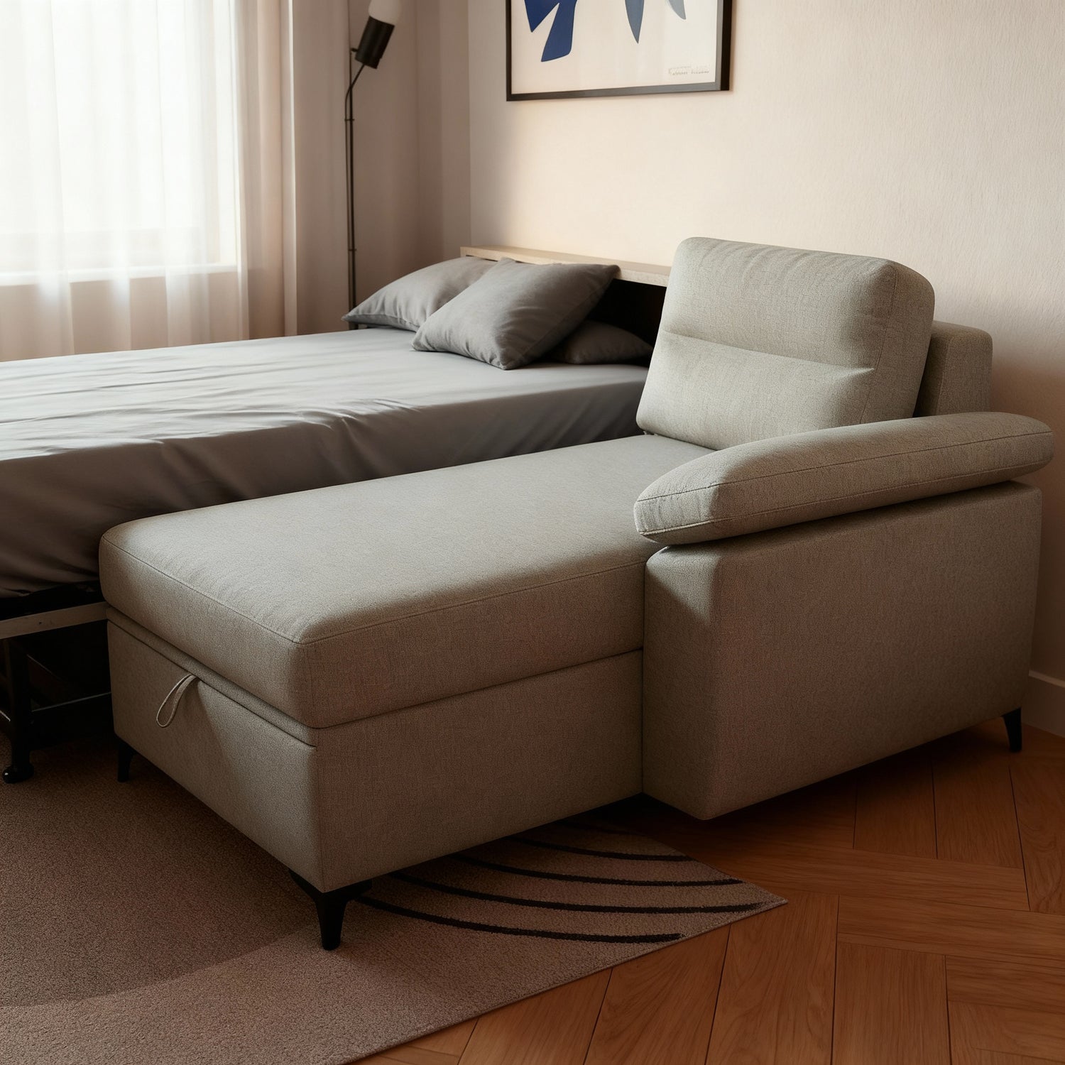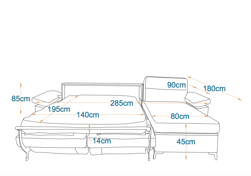 حوّل مساحة معيشتك الي غرفة نوم واسعة ومريحة، تجمع بين الراحة والرقي مع مرتبة إرتفاع 14 سم قابلة للطي بعرض140 سم، ومزيج متطور من الراحة والعملية والتصميم العصري. تتميز هذه الركنه بآليات Sedac -Meral المتطورة، ويوفر مساحة تخزين واسعة ومتانة وأناقة لا مثيل لها.