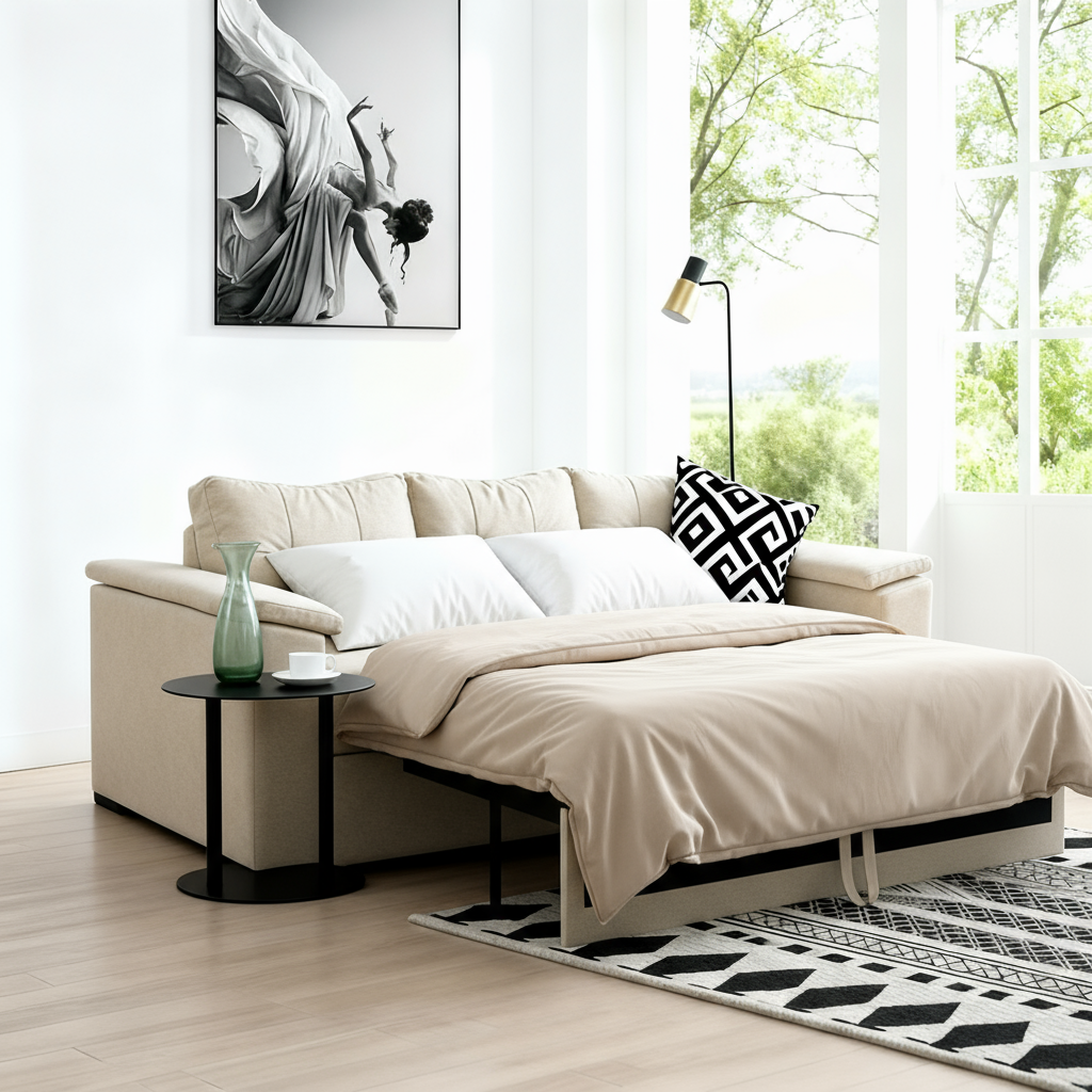 كنبه سرير الخيار الأمثل للمساحات الصغيرة أو الغرف التي تُستخدم لعدة أغراض وتتميز بتصميم عصري ومظهر أنيق.تأتي هذه الكنبة المميزة بمقعدين مريحين ووسائد خلفية فاخرة، بالإضافة إلى أذرع كبيرة توفر دعمًا إضافيًا وراحة قصوى. وإذا كنت بحاجة إلى مساحة إضافية للنوم، فلا داعي للقلق! يمكنك بسهولة سحب الإطار السفلي وتحويلها إلى سرير مريح يتسع لشخصين خلال ثوانٍ معدودة.