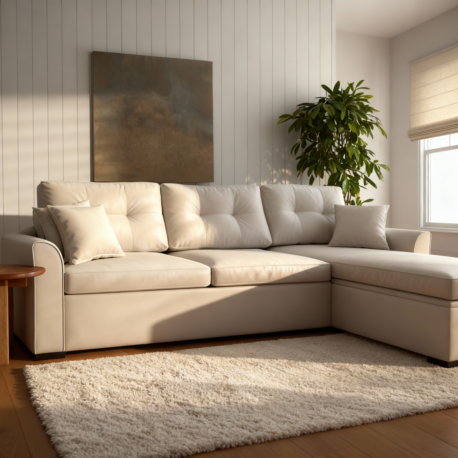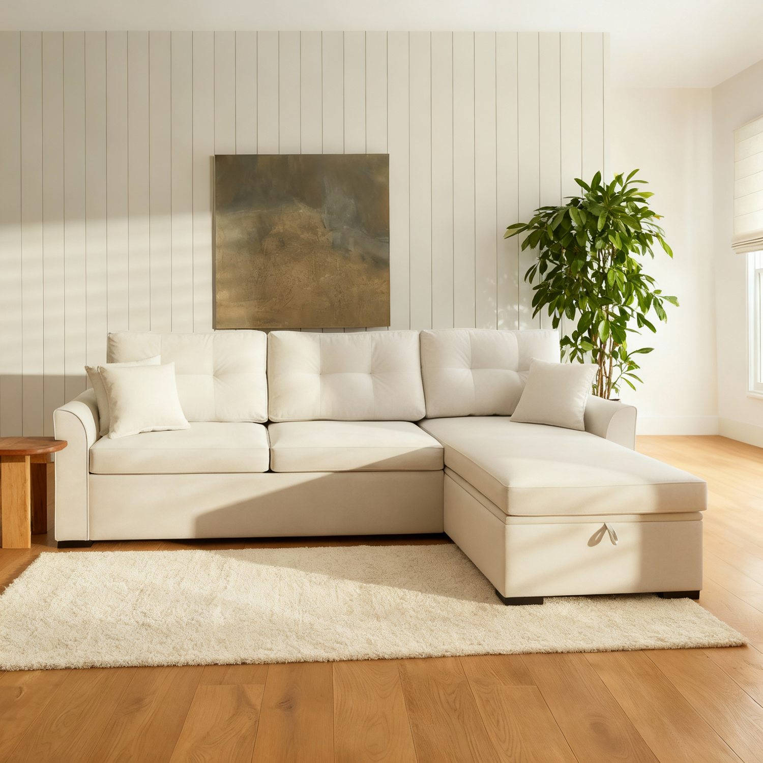 تالا- ركنه سرير شكل حرف L - أبعاد الكنبه: (عرض 275 سم * طول 180 سم * إرتفاع 85 سم ) أبعاد السرير: (عرض 140 سم * طول 195 سم * تخانة مرتبه 14 سم) / Beige / يمين
